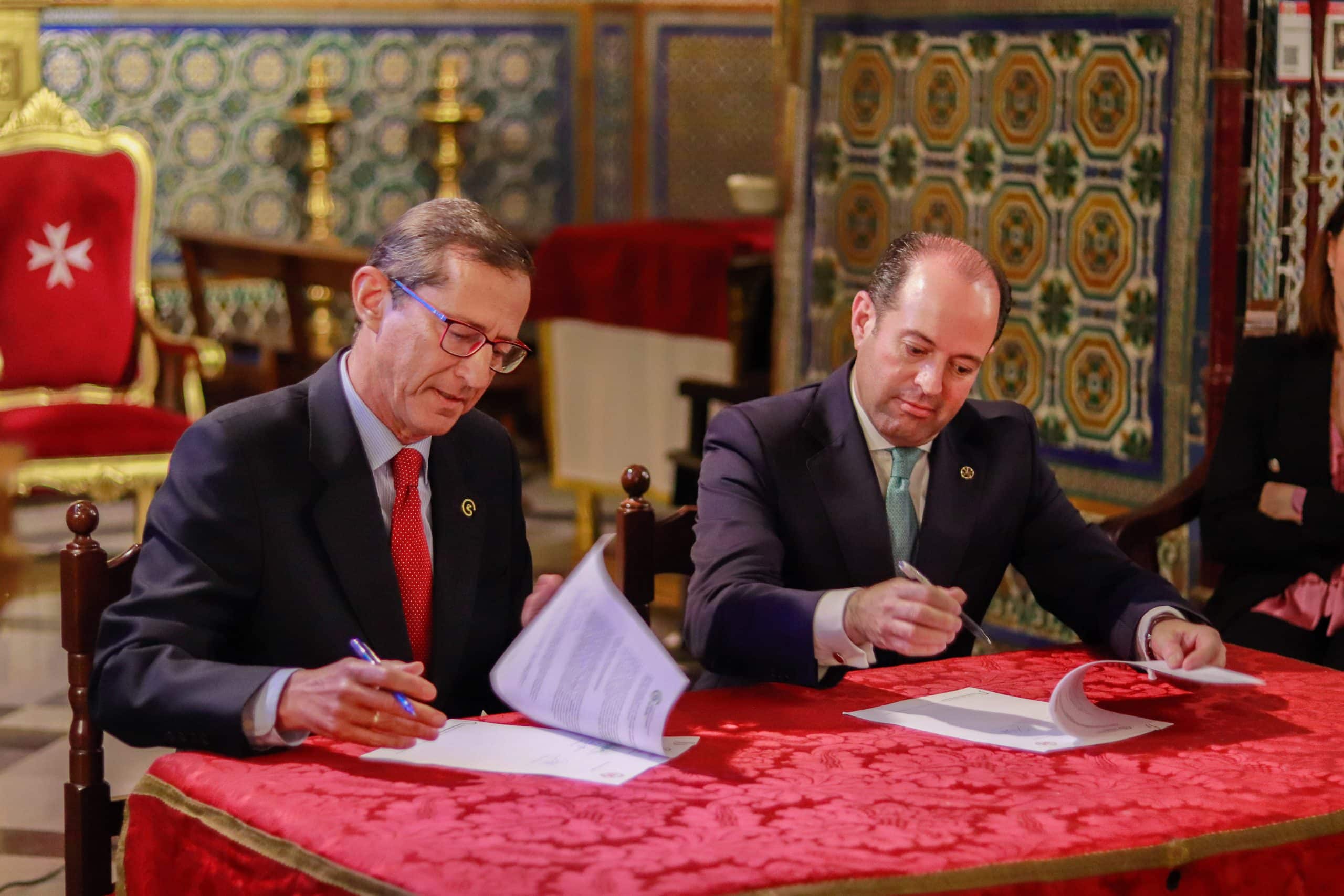 D. Enrique Esquivias, vocal de la AECC en Sevilla, en la firma del convenio junto a Nuestro Hermano Mayor, Aníbal Tovaruela