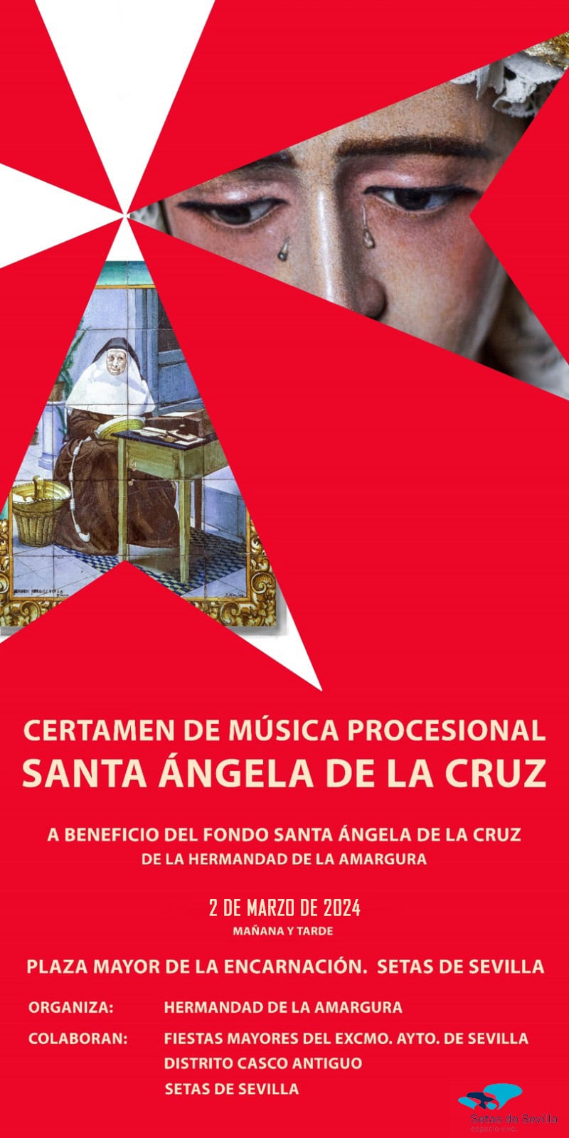 Las inclemencias meteorológicas impidieron que el pasado 4 de noviembre de 2023 pudiéramos celebrar en la Plaza Mayor de las Setas de Sevilla el I Certamen de Marchas Procesionales ‘Santa Ángela de la Cruz’, cuyos beneficios irían destinados al Fondo Social Santa Ángela de la Cruz.