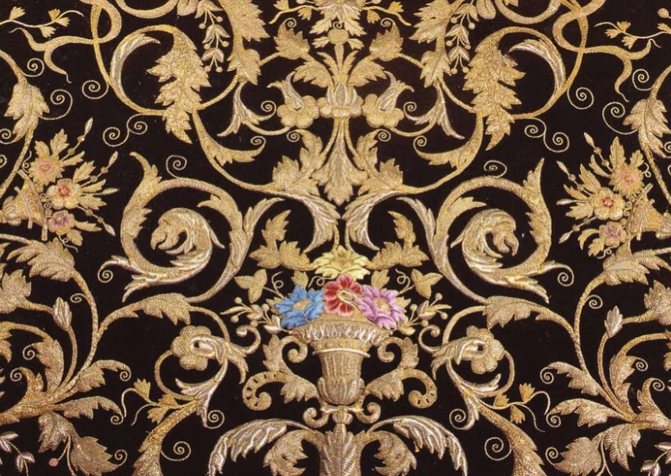 La túnica presentaba una hermosa composición simétrica, predominantemente vegetal, que incluía elementos del repertorio renacentista —como dragones y jarras— junto a otros propios del Art Nouveau, —como las sinuosas lazadas o los racimos de frutas—.