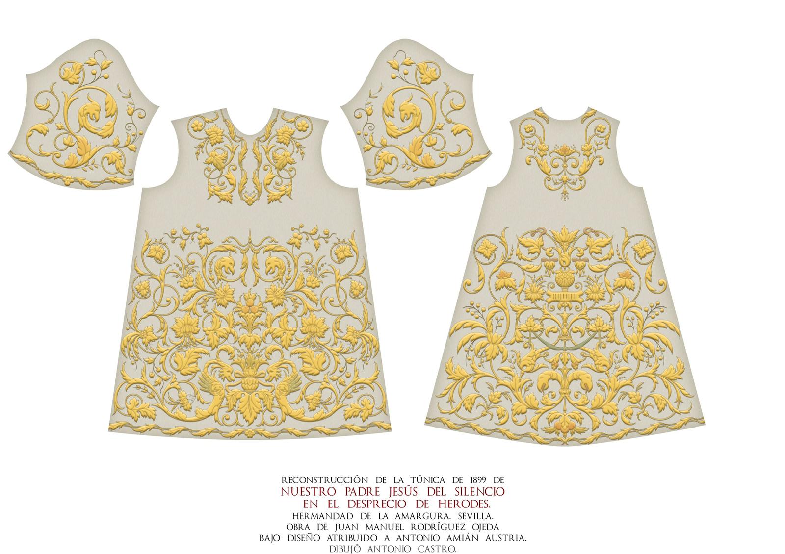 Esta idea, recurrente en sus trabajos, tuvo su continuidad más evidente en el manto de la Virgen de Regla de los Panaderos (hoy perteneciente a la Soledad de Cantillana). Dicha obra, bordada también por Ojeda en 1899 bajo diseño de Amián, resulta una pieza «hermana» de la túnica del Señor del Silencio. Basándonos en estas similitudes, nos inclinamos a señalar a Antonio Amián Austria como el autor del diseño.
