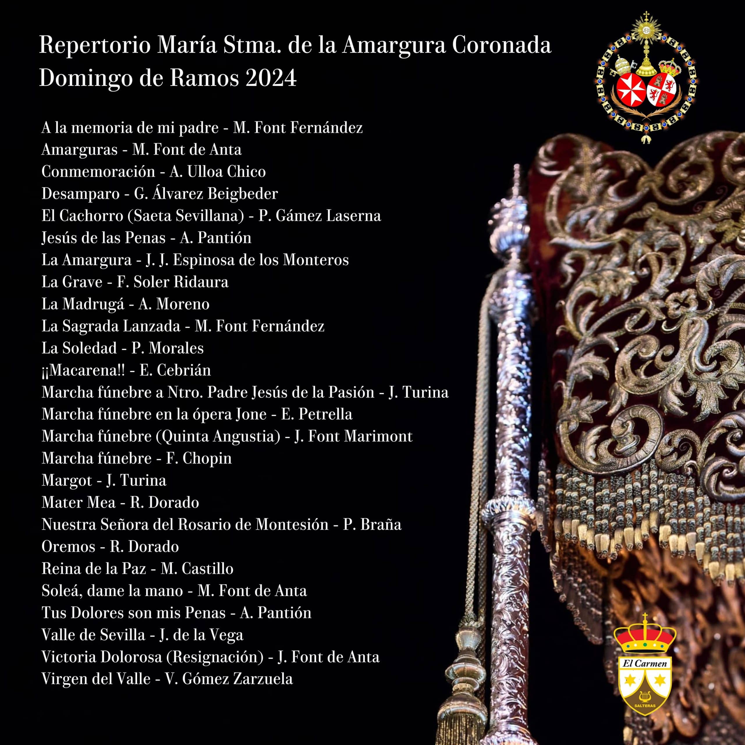 En lo que al repertorio del paso de la Virgen de la Amargura se refiere, destacar, entre las incorporaciones, la vuelta al mismo de marchas de la familia Font. Concretamente se incorporan “A la memoria de mi padre” de Manuel Font Fernández y “Victoria Dolorosa (Resignación)” de su hijo, José Font de Anta.  Es especialmente reseñable que esta última cumple en este 2024 el centenario de su estreno en la Semana Santa, que se produjo además el Domingo de Ramos de 1924 tras el paso de la Virgen de la Amargura.