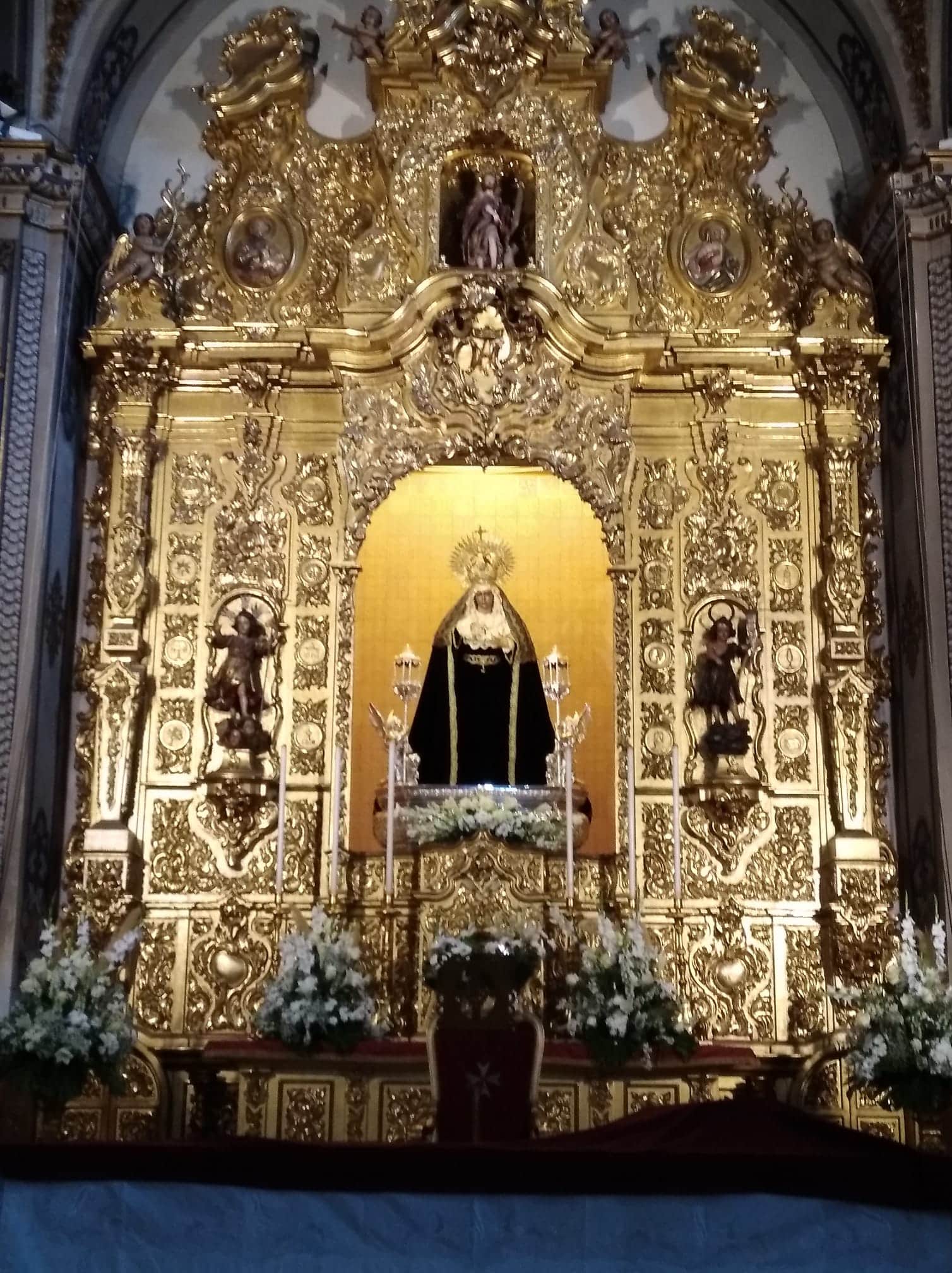 En ausencia de San Juan Evangelista, María Santísima de la Amargura preside en solitario su camarín en el Altar Mayor de San Juan de la Palma.